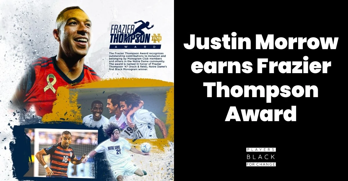 Justin Morrow ’10, former Notre Dame men’s soccer standout and team captain, has been honored with the Frazier Thompson Award for his exceptional contributions to inclusion and belonging within the Notre Dame community. After graduating from the Mendoza College of Business and enjoying a 12-year Major League Soccer career with San Jose and Toronto FC, Morrow became a leading advocate for racial equity in sports.